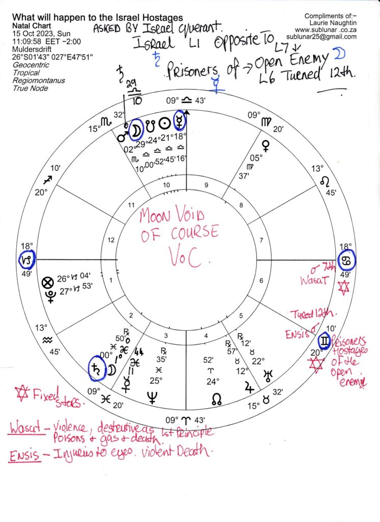 HORARY QUESTION By Laurie Naughtin www.sublunar.co.za WHAT WILL HAPPEN TO THE IRAEL HOSTAGES? During an interesting CAA meeting where sharing